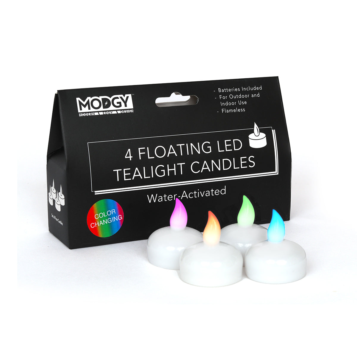 Luminous luminaries expand with water and illuminate with a flameless, water-activated floating candle