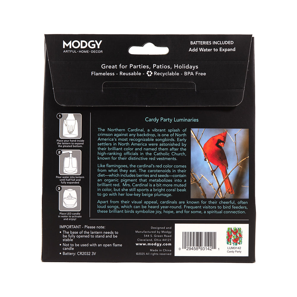 MODGY Cardy Party Luminaries seamlessly blend timeless artistry with modern illumination, each pack including four lanterns and four water-activated LED candles, batteries included. Setting the mood with soft lighting and eye-catching designs, these collapsible wonders enhance every moment. Modgy luminaries offer functionality and elegance perfect for any occasion, from large events to tranquil evenings.